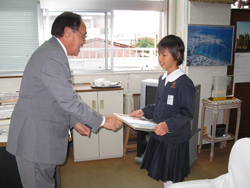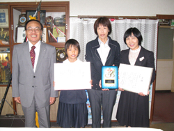 ポスターの部で最優秀賞に選ばれた与論小学校4年生の瀧若菜さんと、学校賞に選ばれた与論小学校に南町長から賞状と副賞の伝達が行われました。