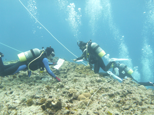 リーフチェックは、サンゴ礁の斜面に沿って魚類(チョウチョウウオ・ブダイなど)や無脊椎生物(ウニ・シャコガイなど)を数えたり、サンゴ礁を覆っているもの(サンゴ・海藻など)を記録していく調査です。