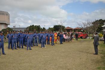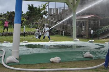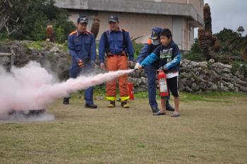 第58回 文化財防火デー 最終更新日:2012年2月2日 印刷 1月29日、町指定文化財の与論城跡で行われた「文化財防火デー」に、消防団や与論分遣所、地域の人が参加しました。琴平神社境内からの出火を想定した一斉放水、消火器を使った小学生の消火訓練があり、万一の火災に備え参加者全員が真剣に取り組みました。